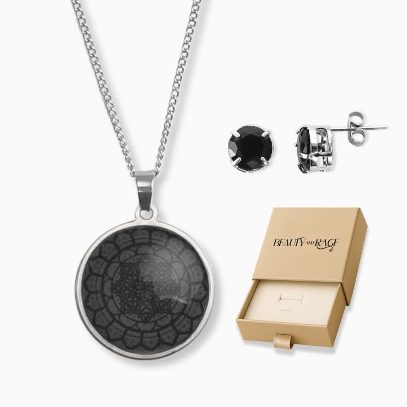 Kit Conjunto Colar Mandala Preta M1 e Brinco Zircônia Negra 8mm