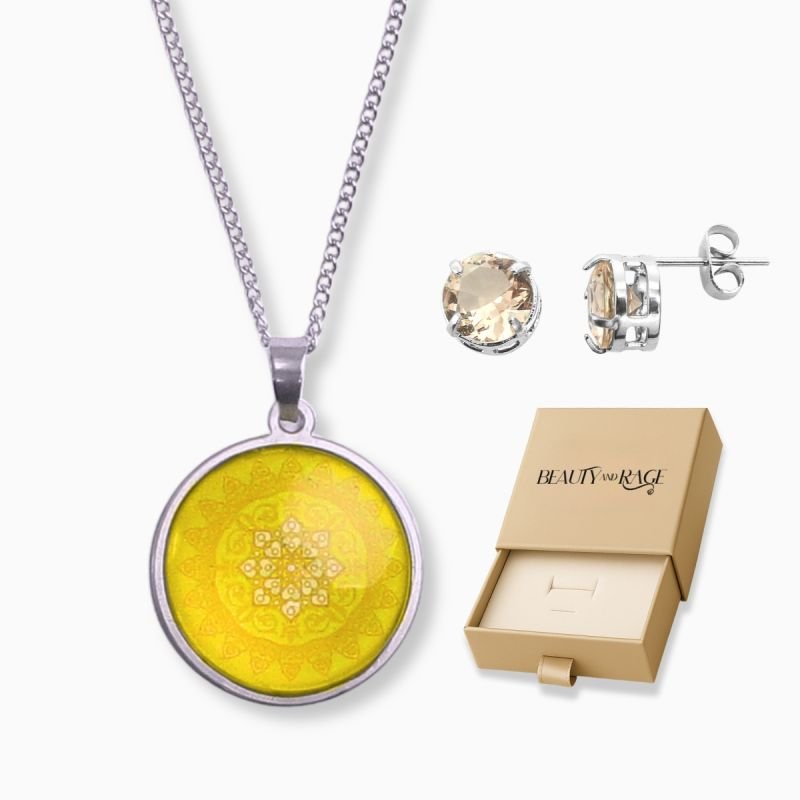 Kit Prosperidade Conjunto Colar Mandala Amarela M3 e Brinco Zircônia Citrino 8mm