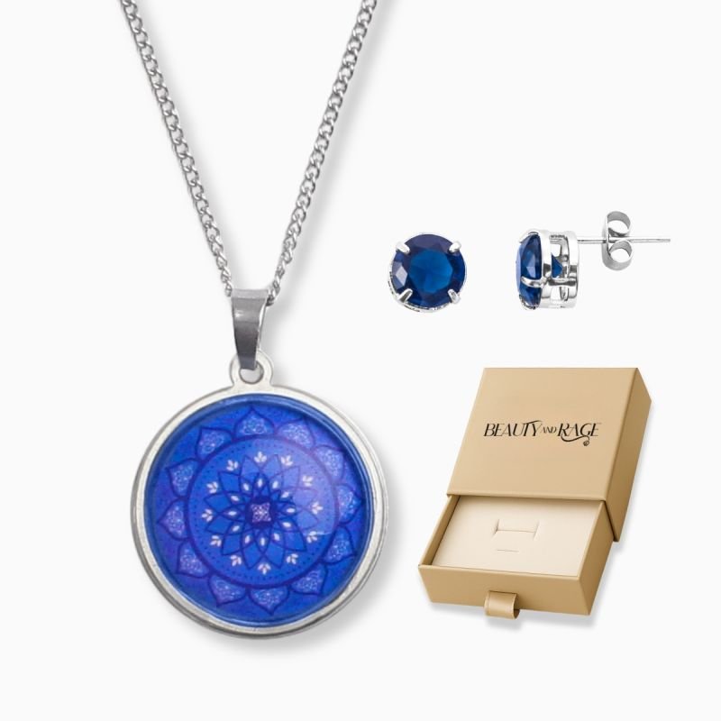 Kit Proteção Conjunto Colar Mandala Índigo M1 e Brinco Zircônia Safira 8mm