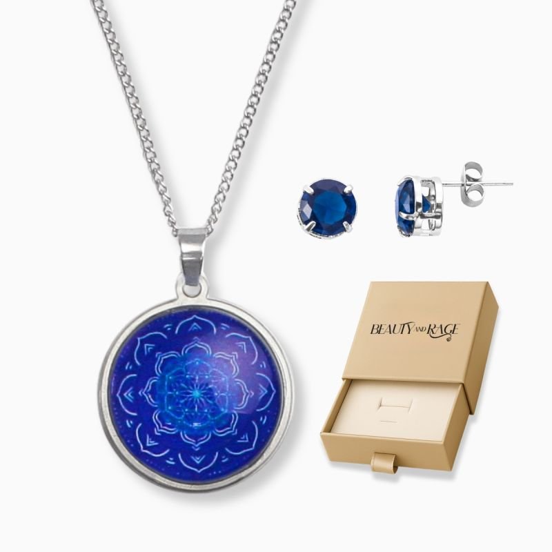 Kit Proteção Conjunto Colar Mandala Índigo M3 e Brinco Zircônia Safira 8mm